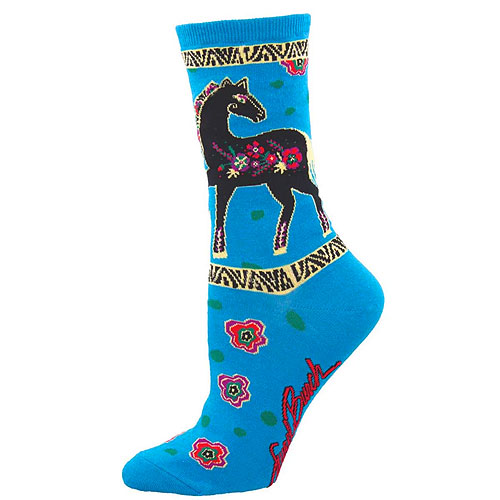 These vibrant socks feature vivid imagery of Laurel Burch's iconic artwork, making a perfect holiday gift for a special someone who wants to keep their feet warm with a fashionable flair! Laurel Burch 'Floral Horse - Blue' socks, 54% Nylon / 44% Cotton / 2% Spandex, women's sock size 9-11, by Socksmith.