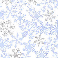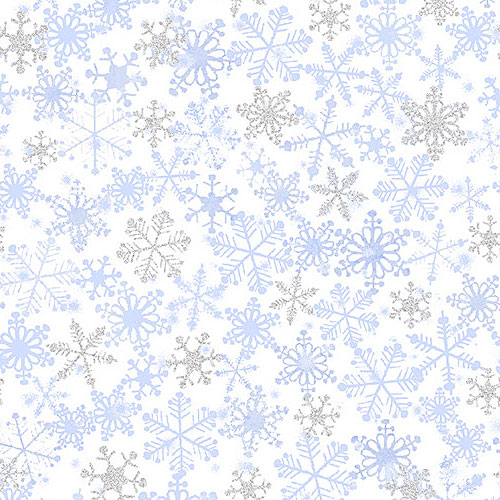 Large scale crystalline snowflakes fall gently over an atmospheric ground, shimmering with an extra touch of metallic in this icy fresh design. Larger snowflakes are about 5/8", with silver metallic glitter, from the 'Ice' collection by Timeless Treasures.