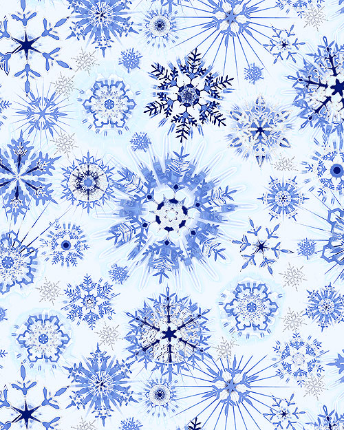 Large scale crystalline snowflakes fall gently over an atmospheric ground, shimmering with an extra touch of silver metallic in this icy fresh design. Larger snowflakes are about 4 1/2", with silver metallic glitter, from Timeless Treasures.