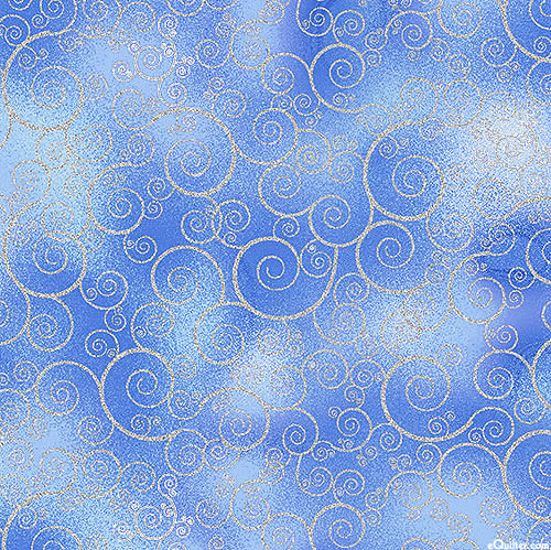 Various spirals etched with silver metallic glitter, overlap and swirl over an atmospheric ground in this serene and wintry abstract. Larger curls are about 3/4", with silver metallic glitter, from the 'Ice' collection by Timeless Treasures.