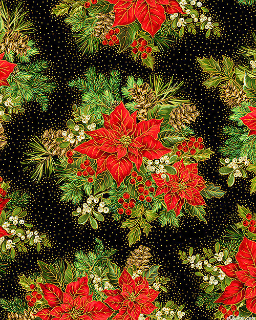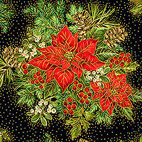 A merry bouquet of poinsettia flowers brings a festive air to this elegant Christmas-themed design. Larger poinsettias are about 4-1/2", with gold metallic, from the 'Joyful' collection by Dona Gelsinger for Timeless Treasures.