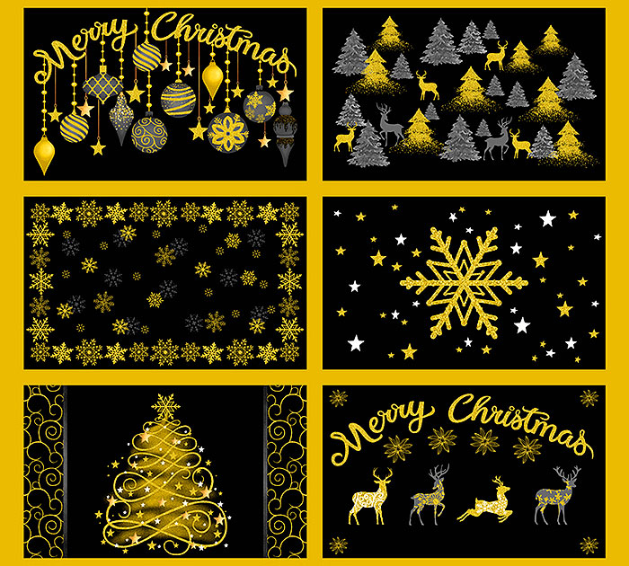 Panel blocks contain various festive Christmas scenes and motifs including ornaments, reindeer, evergreens, snowflakes, and shimmering stars. 36" panel, panel has six frames about 17-3/4" x 11", with gold metallic, from the 'Merry Christmas' collection by Timeless Treasures.