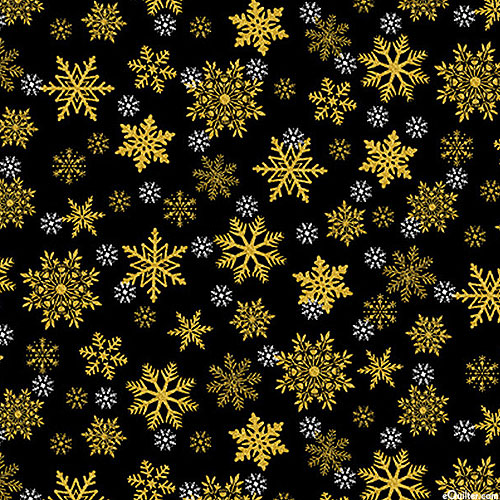 Small snowflakes fall across this simple wintry design. Larger snowflakes are about 1", with gold metallic, from the 'Merry Christmas' collection by Timeless Treasures.