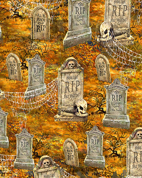 Spooky graves decorated in skulls and spiderwebs lend a festive flair to this Halloween-themed design. Digitally printed, larger tombstones are about 4", from the 'Bewitched' collection by Dona Gelsinger for Timeless Treasures