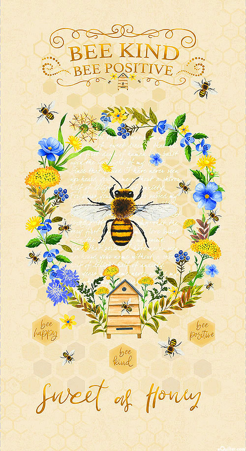 A wholesome slogan is written above a wreath of flowers surrounding a queen honeybee in this heartwarming panel. Digitally printed, 24" panel, from the 'Bee Kind' collection by Timeless Treasures.