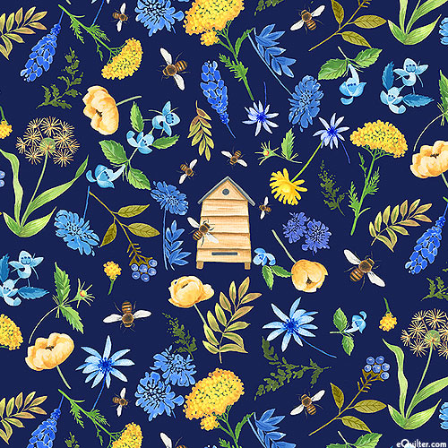 Honeybees buzz busily between lush flowers and their beehives in this charming design. Digitally printed, larger beehives are about 2", 'Tossed Small Floral' from the 'Bee Kind' collection by Timeless Treasures.