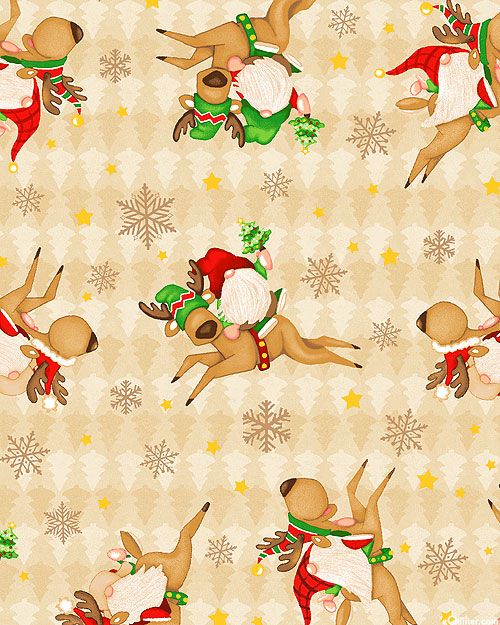 Adorable, big-nosed gnomes ride reindeer every which way! They jump among snowflakes and stars, holding miniature Christmas trees. Larger reindeer are about 2-1/4", from the 'Timber Gnomies Tree Farm' collection by Shelly Comiskey for Henry Glass & Co.