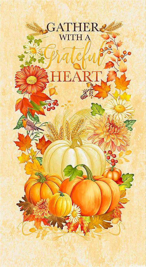 Harvest motifs lend a festive flair to this Thanksgiving-themed panel as pumpkins, florals, and Autumn leaves surround a heartwarming message of gratitude and community. Digitally printed, 24" panel, from the 'Gather With A Grateful Heart' collection by Timeless Treasures.