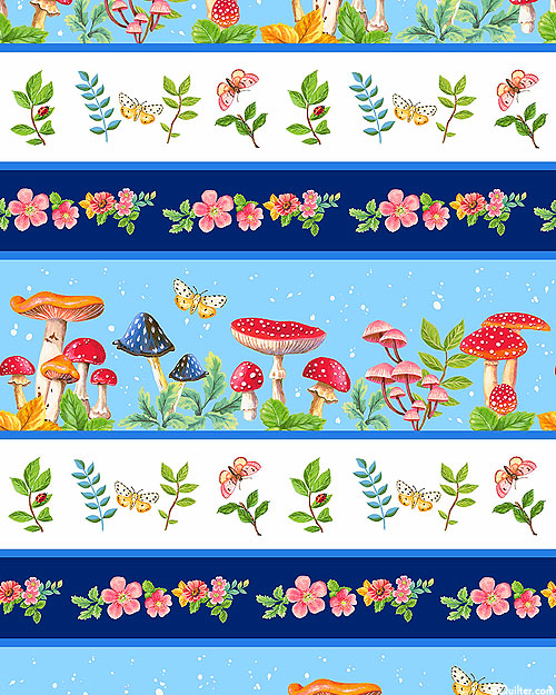 Layered between the stripes of this woodsy design is vibrant imagery of florals, fungi, and various creatures that inhabit the undergrowth of the forest. Wider stripes are about 3-3/4", stripes run the length of the fabric, from the 'Enchanted Forest' collection by Jane Alison for Henry Glass & Co.
