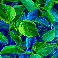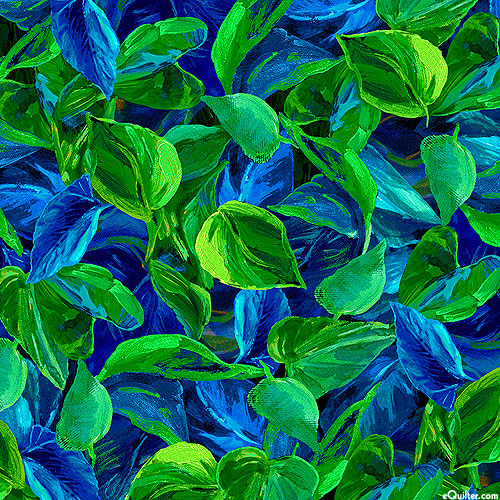 A lush and verdant landscape of leafy fronds are depicted in a vibrant and painterly style. Digitally printed, larger leaves are about 2", from the 'Sunflower Symphony' collection by Timeless Treasures.