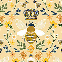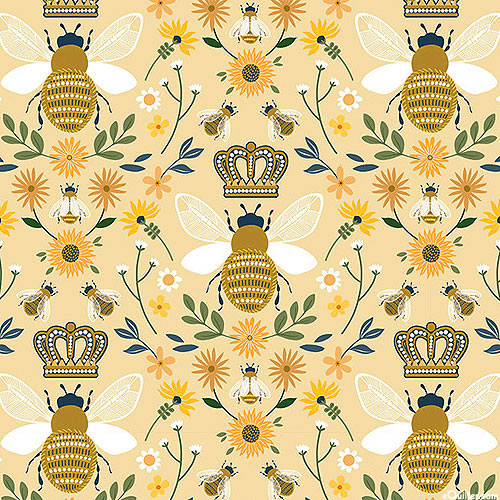 Queen bees and their royal crowns are framed by garden imagery including florals, leaves, and smaller honeybees. Digitally printed, larger bees are about 1-1/2", from the 'The Bees Knees' collection by Dear Stella, a division of Timeless Treasures.
