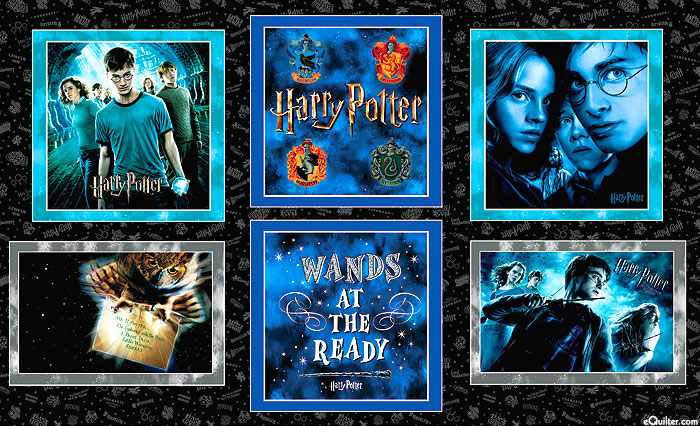 This project panel features scenes from the beloved Harry Potter series that can be sewn into magical pillows for any fan of the series. 58" wide, 36" panel, panel has four frames about 16" x 16", and two frames about 18" x 12", 'Harry Potter Pillow Panel' from the 'Harry Potter' collection by © Warner Bros. for Benartex Fabrics