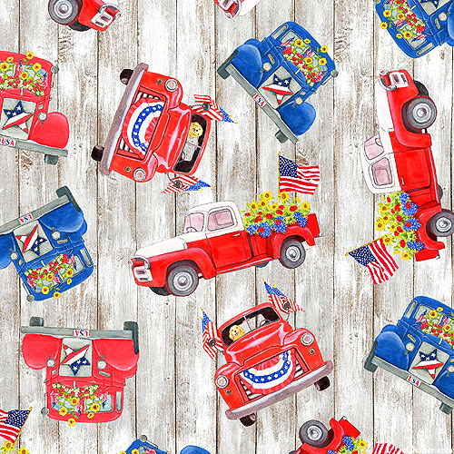 Vintage trucks decorated in American flags and flowery bouquets are driven by golden retrievers in this whimsical and patriotic design. Digitally printed, larger trucks are about 3", from the 'Liberty Barn' collection by Gwendolyn Babbitt for Studio E Fabrics.