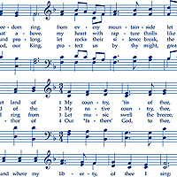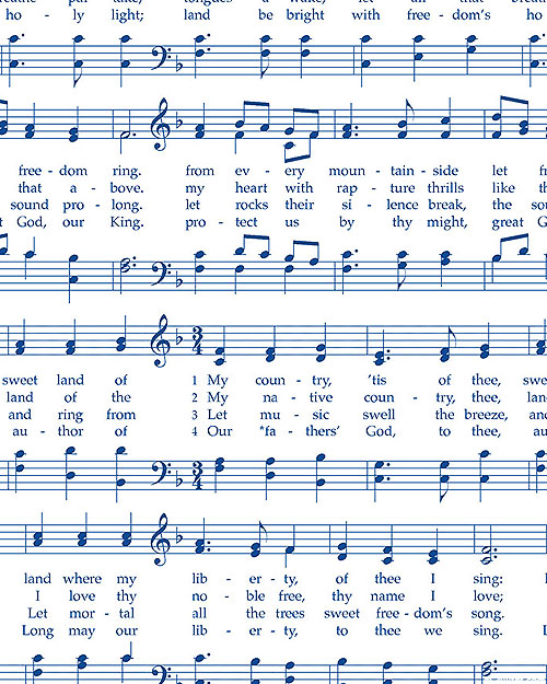 The sheet music and lyrics to the classic song, "My Country, 'Tis of Thee" are written across the design. Digitally printed, larger notes are about 1/4", from the 'Liberty Barn' collection by Gwendolyn Babbitt for Studio E Fabrics.