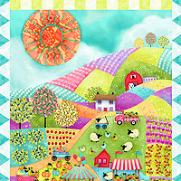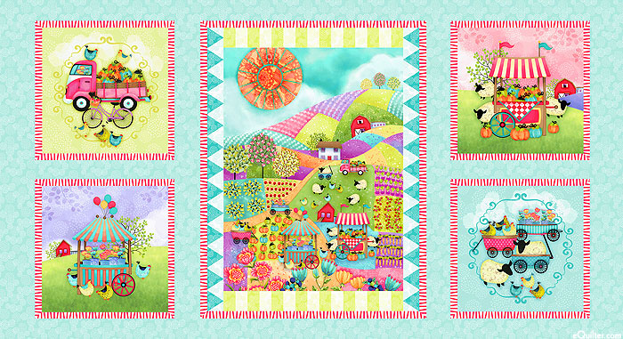 Panel blocks contain scenes from the countryside including rolling hills composed of quilts, farmers stalls & wagons, trucks, bicycles, and barns. Digitally printed, 24" panel, panel has four frames about 9-3/4" x 9-3/4", and one frame about 16" x 21", from the 'Country Fair' collection by Nancy Archer for Studio E Fabrics.