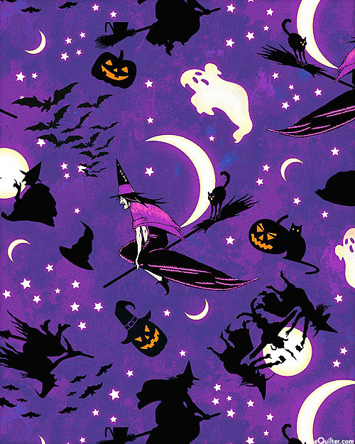 A festive assortment of Halloween motifs are scattered across the design including witches riding on brooms, jack o' lanterns, and black cats. Larger witches on broomsticks are about 3-1/2", from the 'Bones and Bouquets' collection by Kathleen Francour for Studio E Fabrics.