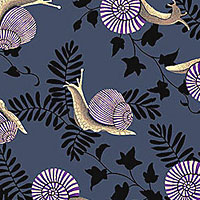 Small snails are tossed across the design with verdant forest fronds scattered in the space between. Larger snails are about 1-1/2", from the 'Hallowed Forest' collection by Grace Popp for Studio E Fabrics.