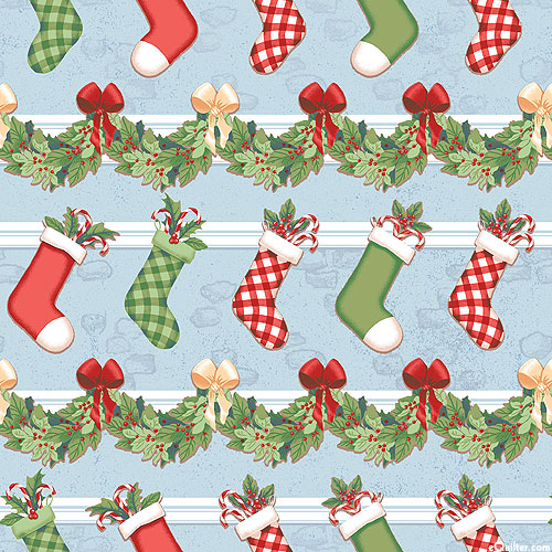 Banners of holly decorated in ribbons divide the design into striped layers with festive stockings hanging between. Larger stockings are about 1-1/2", from the 'Christmas Village' collection by Rebecca Canale for Studio E Fabrics.