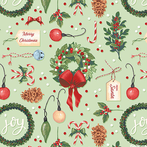 Wreaths hang on the wall with a merry mix of festive motifs scattered in the space between including holly sprigs, pine cones, ornaments, candy canes, and jingle bells. Larger wreaths are about 2", from the 'Christmas Village' collection by Rebecca Canale for Studio E Fabrics.
