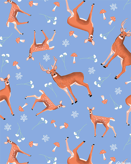 Charming forest deer are scattered across the design with mushrooms and florals tossed in the space between. Larger deer are about 3", from the 'Woodland Magic' collection by Ashley Satanosky for Studio E Fabrics.