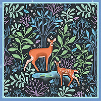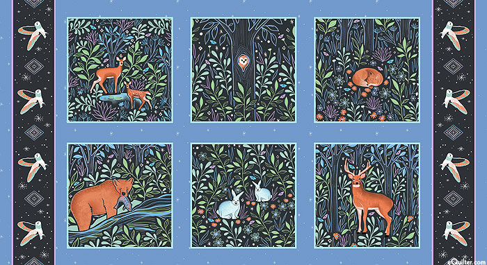 Panel blocks contain verdant forest scenes with various wild animals including rabbits, deer, foxes, bears, and owls. 24" panel, panel has six frames about 9-1/2" x 9-1/2", from the 'Woodland Magic' collection by Ashley Satanosky for Studio E Fabrics.