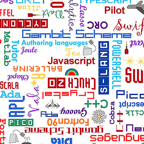 A collage of various programming languages are depicted across the design including C++, Javascript, Swift, and more. Taller text is about 1/2", from the 'Data Point' collection by Judy Gauthier for Studio E Fabrics.
