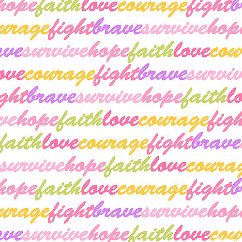 A collection of hopeful words of solidarity for those with breast cancer are written out across the design. Taller text is about 3/8", from the 'Pink Power' collection by Lilac Bee Designs for Studio E Fabrics.