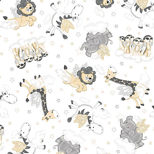 Soaring among the heavens on fluttering angel wings are an adorable cast of lions, elephants, meerkats, and zebras, lending a whimsical charm o this children's design. Giraffes are about 3-1/4", from the 'Moonlit Dreams' collection by Victoria Hutto for Studio E Fabrics.