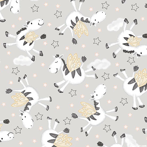 Soaring among the heavens on fluttering angel wings are an adorable cast of zebras, lending a whimsical charm o this children's design. Larger zebras are about 2", from the 'Moonlit Dreams' collection by Victoria Hutto for Studio E Fabrics.