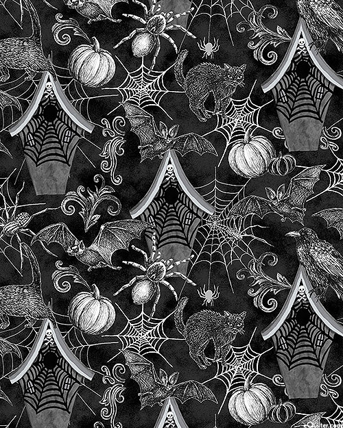 A festive assortment of Halloween motifs are scattered across the design including pumpkins, black cats, spiders & spiderwebs, and vampire bats. Digitally printed, larger bird houses are about 4", from the 'Fear Factory' collection by Lena Art Studio for Studio E Fabrics.