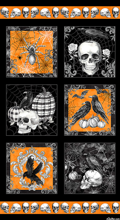 Panel blocks contain a festive assortment of Halloween motifs including ravens, spiders, skulls, vampire bats, and pumpkins. Digitally printed, 24" panel, panel has six frames about 10-1/4" x 10-1/4", from the 'Fear Factory' collection by Lena Art Studio for Studio E Fabrics.