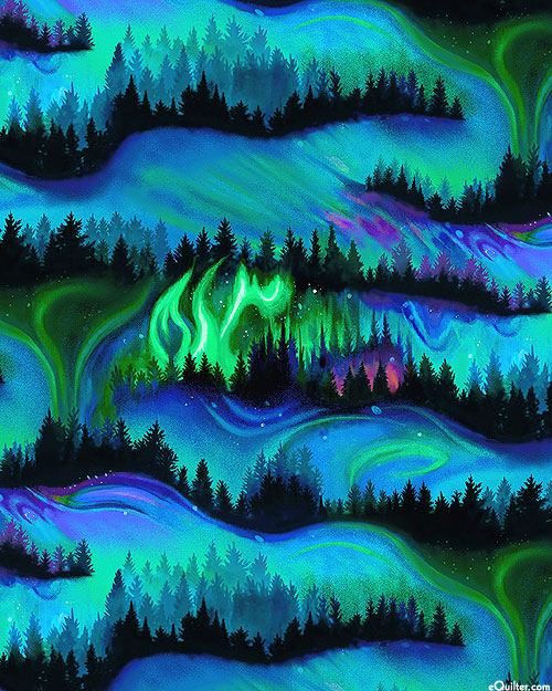 The northern lights dance above an arctic treeline across this beautiful print. Digitally printed, larger color bands are about 2", from the 'Tales of the Tundra' collection by Katy Lipscomb for Studio E Fabrics.