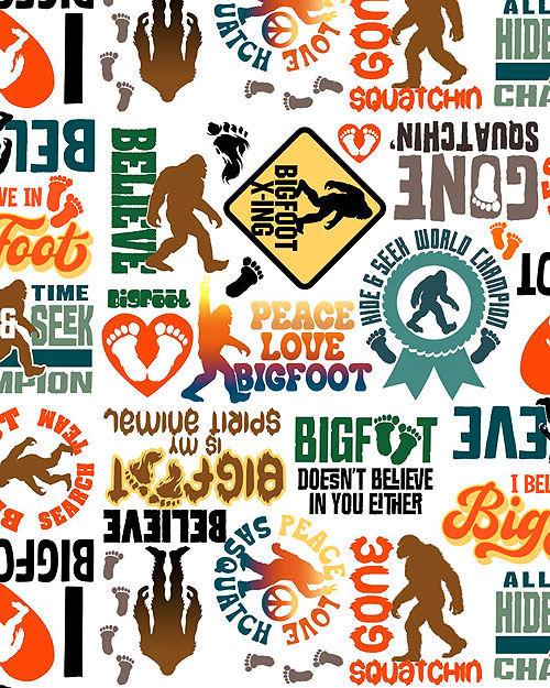 Signs, silhouettes, and slogans related to Bigfoot are tossed across this wild and whimsical print. Digitally printed, larger figures are about 1-3/4", from the 'Legendary Loner' collection by Jim Baldwin for 3 Wishes Fabric.