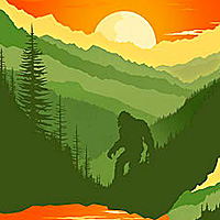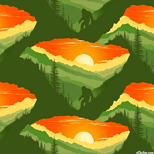Glimpses of a Sasquatch wandering through a forest at sunset are glimpsed in silhouettes layered with colors across the design. Digitally printed, scenes are about 5-3/4" across, from the 'Legendary Loner' collection by Jim Baldwin for 3 Wishes Fabric.