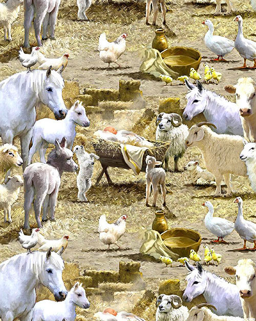 Baby Jesus is surrounded by all the animals of the manger he was born in including horses, lambs, sheep, goats, geese, and mules. Digitally printed, larger horses are about 2-3/4", from the 'Let Us Adore Him' collection by The MacNeil Studio for 3 Wishes Fabric.