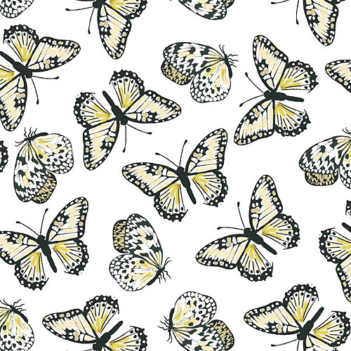 Beautiful butterflies are scattered over a solid background, giving it a sense of movement and flight. Larger butterflies are about 2", from the 'Forest Life' collection by Lisa Perry for 3 Wishes Fabric.