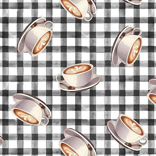 Tossed against a charming gingham check background are several elegant lattes, making this a must-have for any coffee-lover. Larger coffee cups are about 1-3/4", from the 'Coffee Break' collection by Scott Barnes for 3 Wishes Fabric.