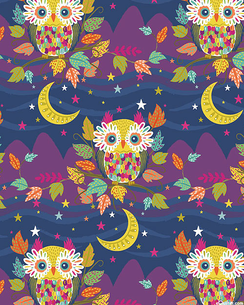 Owls decorated with floral eyelashes are framed by elegant garden imagery across this flowery stripe. Larger owls are about 2-1/4", from the 'Forest Life' collection by Lisa Perry for 3 Wishes Fabric.