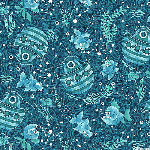 Noah's ark rides the rough waters of the ocean while sharks and fish swim in the depths below this whimsical blender. Larger ships are about 2", from the 'Two By Two' collection by Leanne Anderson and Katelyn Kuebler for Henry Glass & Co.