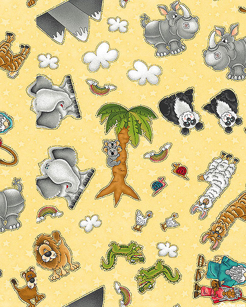 "They came into the ark with Noah two by two". Various pairs of animals about to board Noah's ark are seen across the design including rhinos, koalas, alpacas, elephants, lions, and alligators. Larger animals are about 3-1/4", from the 'Two By Two' collection by Leanne Anderson and Katelyn Kuebler for Henry Glass & Co.