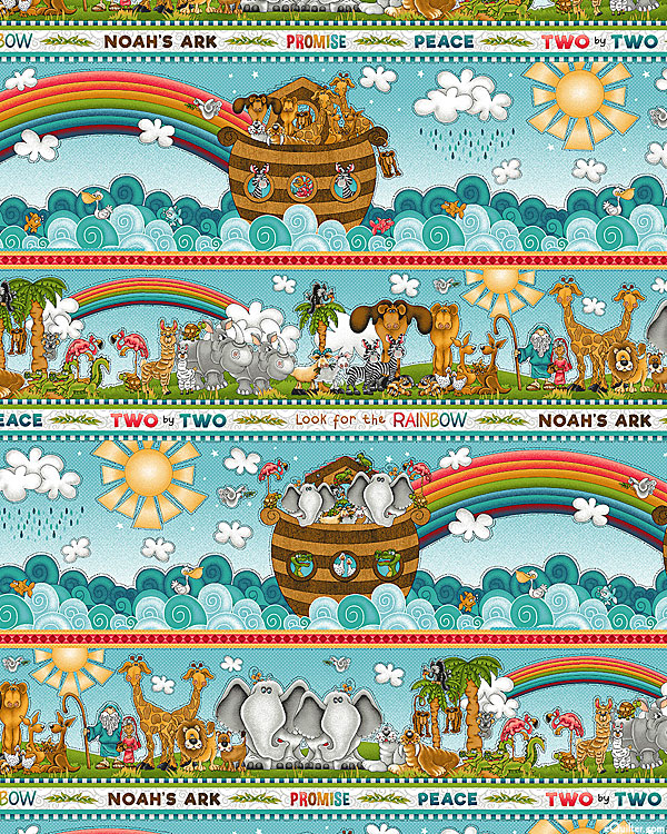 "They came into the ark with Noah two by two". Various pairs of animals aboard Noah's ark are seen peering out the windows of the ark including sheep, monkeys, vultures, zebras, giraffes, elephants, flamingos, kangaroos, storks, and walruses. Wider stripes are about 5-1/4", stripes run the length of the fabric, from the 'Two By Two' collection by Leanne Anderson and Katelyn Kuebler for Henry Glass & Co.