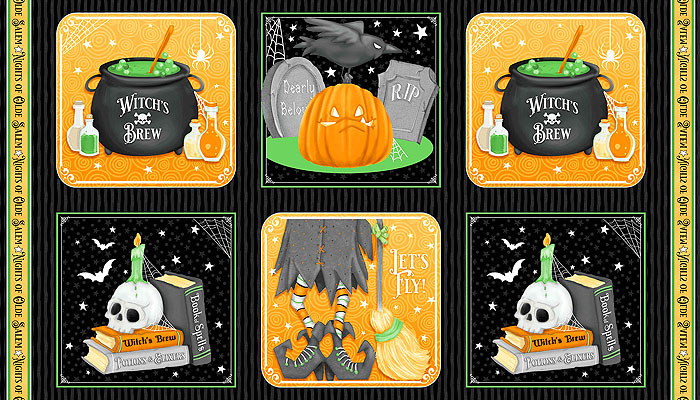 Panel blocks contain a festive assortment of Halloween-themed motifs including jack o' lanterns, cauldrons, tomes, witch's brooms, skulls, gravestones, and ravens. 25" panel, panel has six frames about 11" x 10-3/4", with glow-in-the-dark, from the 'Nights Of Olde Salem' collection by Shelly Comiskey for Henry Glass & Co.