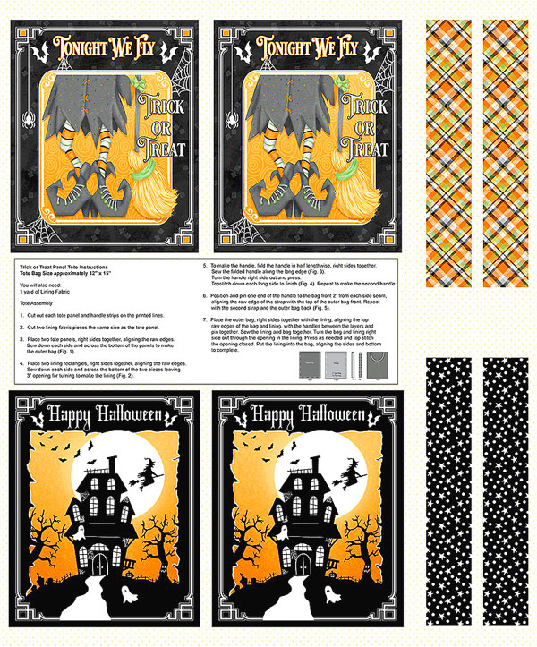This tote bag project panel features a festive assortment of Halloween motifs including witches, haunted mansions, and spooky ghosts. 36" panel, with glow-in-the-dark, from the 'Nights Of Olde Salem' collection by Shelly Comiskey for Henry Glass & Co.