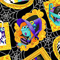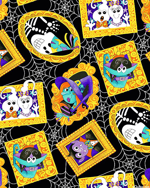 A whimsical toss of Halloween-themed portraits are scattered across the design featuring imagery of skeletons, witches, black cats, ghosts, and vampires. Larger frames are about 3-1/4", from the 'Witch's Night Out' collection by Delphine Cubitt for Henry Glass & Co.
