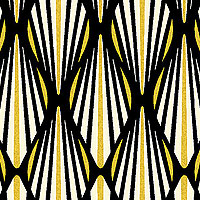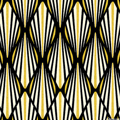Diamond shapes contain a multitude of branching lines that repeat endlessly across the design. Larger diamonds are about 2" tall, with gold metallic, from the 'Black, White & 24 Karat' collection by Color Principle for Henry Glass & Co.