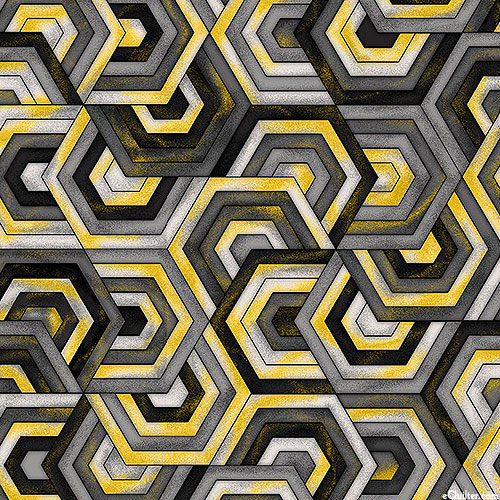 Concentric hexagons overlap in a kaleidoscopic cascade of shadow and depth. Larger hexagons are about 2-1/2", with gold metallic, from the 'Black, White & 24 Karat' collection by Color Principle for Henry Glass & Co.