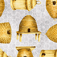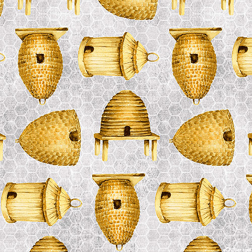 Wooden beehives of various shapes and sizes are scattered against a hexagonal repeat background reminiscent of honeycomb. Larger beehives are about 2" from the 'Sweet Bees' collection by Barb Tourtillotte for Henry Glass & Co.