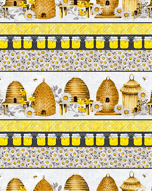 Layered stripes contain wholesome scenes of honey jars, beehives, wildflowers, and honeybees. Wider stripes are about 4", stripes run the length of the fabric, from the 'Sweet Bees' collection by Barb Tourtillotte for Henry Glass & Co.