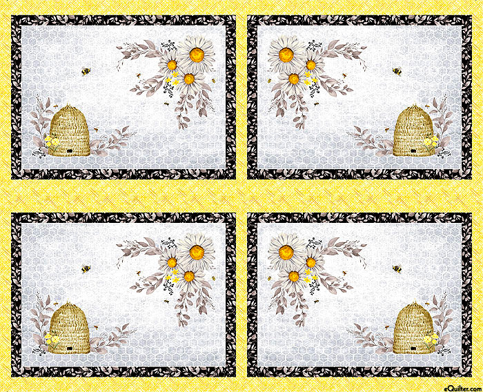 Panel blocks contain wholesome scenes of beehives, wildflowers, and honeybees. 35" panel, panel has four frames about 14-1/2" x 20-1/4", from the 'Sweet Bees' collection by Barb Tourtillotte for Henry Glass & Co.