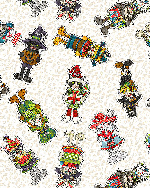 Adorable kitties are dressed in a variety of fun costumes including witches, elves, leprechauns, and Uncle Sam. Larger cats are about 3", from the 'Hat On A Cat' collection by Leanne Anderson and Katelyn Kuebler for Henry Glass & Co.